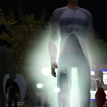 My travels through one of today’s self-proclaimed leading online worlds, SECOND LIFE, took place in the fall of 2008 from my home in Surrey BC, Canada. I went sightseeing in several of its virtual domains and photographed my screen from my embodied existence in real time and space similar to how I would approach my ‘real life’ holiday snapshots. The large C-prints produced from these negatives give presence to the ‘woolly’ RGB phosphors of my CRT monitor: the phosphor dots simultaneously deconstruct the image as a ‘light show’ and call up material associations with, for example, fabrid or an embroidered surface.